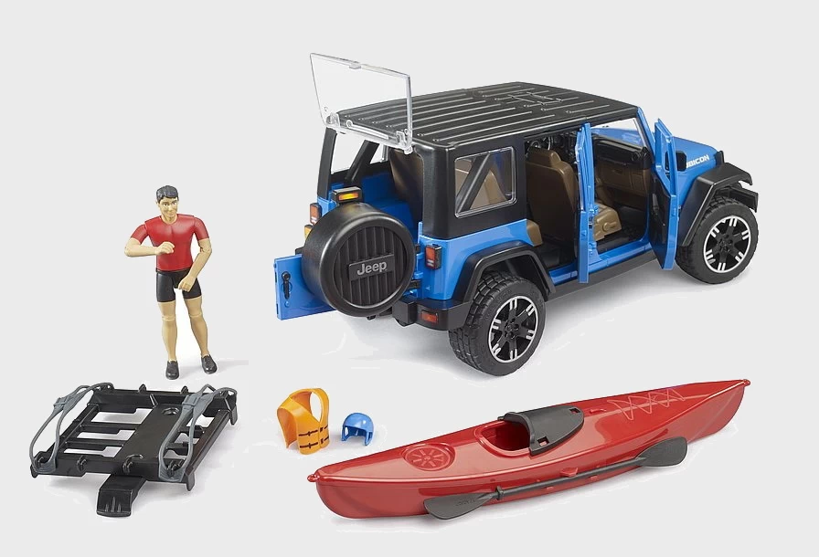Um an die schönsten Wassersport Gebiete zu gelangen, steht mit dem Jeep Wrangler Rubicon Unlimited ein echtes Offroad Talent zur VerfĂŒgung. Neben dem 2-teilig abnehmbaren Segmentdach, lassen sich auch die Motorhaube, die HecktĂŒr und alle vier TĂŒren öffnen. SelbstverstĂ€ndlich sind die PlatzverhĂ€ltnisse so, dass auch vier BRUDER bworld Figuren in das Fahrzeug passen. Alternativ zu der Vollbesetzung ist die RĂŒcksitzbank herausnehmbar, um dann im Ladebereich ĂŒber die BRUDER-Normverbinder Zubehör aufnehmen zu können. Die ZusatzlenksĂ€ule dient dem einfachen Lenken durch die Dachluke und kann bei Nichtverwendung im Fahrzeugboden verstaut werden. Die Achsen sind gelĂ€ndewagenĂŒblich gefedert und die profilierten RĂ€der besitzen verchromte Felgen in attraktiver SUV-Optik. Das Kajak wird auf dem mitgelieferten DachtrĂ€ger transportiert.