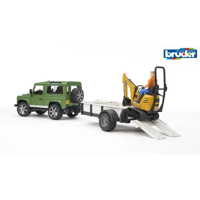 Bruder 02593 Land Rover Defender Station Wagon mit Einachsanhänger, JCB Mikrobagger 8010 CTS und Bauarbeiter