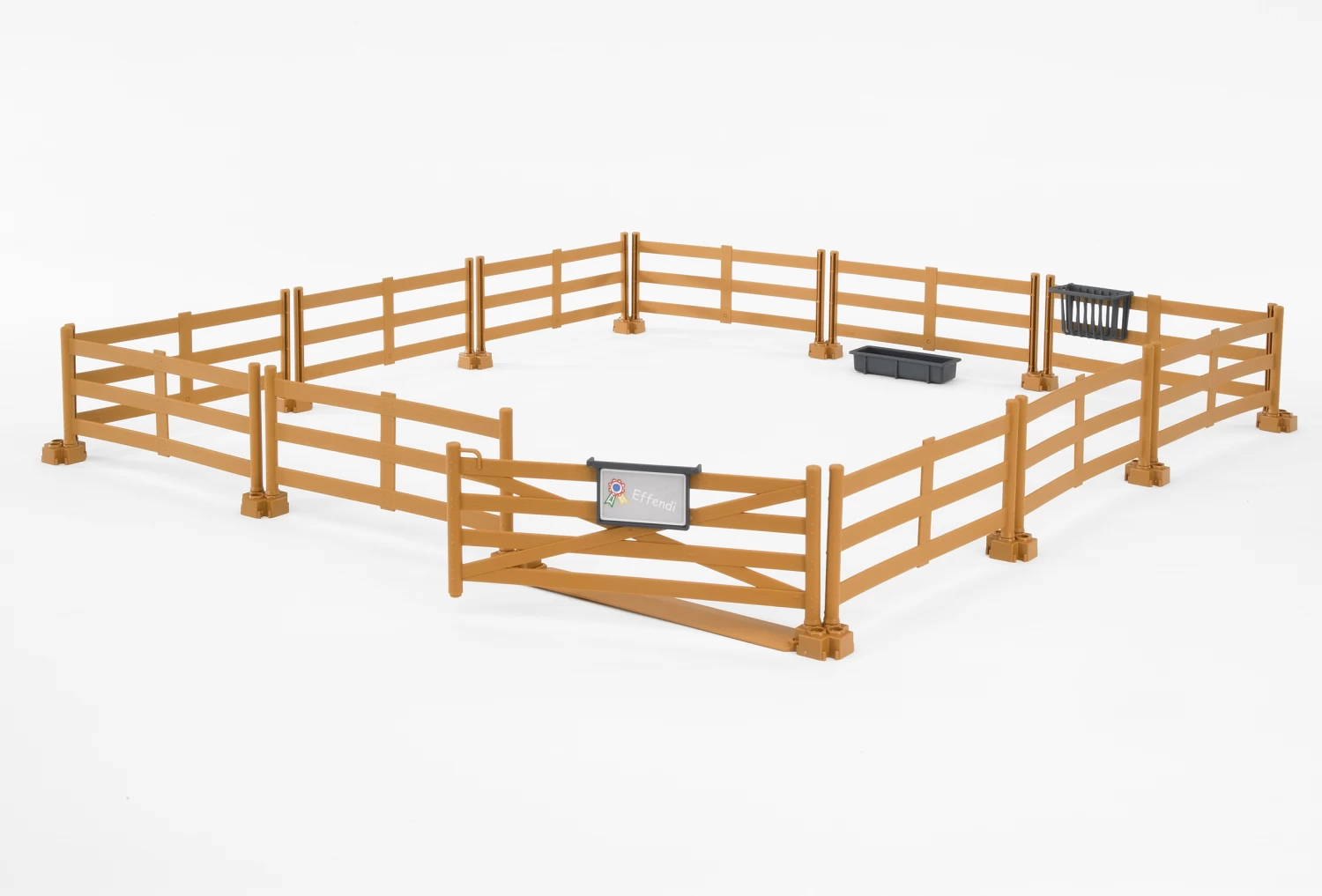 Das Set besteht aus 11 einzelnen braunen Zaunelementen, die mit Hilfe ihrer StandfĂŒĂe (natĂŒrlich auch braun) untereinander verbunden werden können. Zusammen mit dem Torelement mit Bodenschwelle kann man zum Beispiel einen Bereich von 53,5 x 53,5 cm abzĂ€unen. SelbstverstĂ€ndlich kann man jedoch auch eine andere Kombination aufbauen, zum Beispiel entlang eines GebĂ€udes oder natĂŒrlich auch viel gröĂer, wenn man mehrere Sets miteinander kombiniert. Komplettiert wird der Pferdezaun mit so nĂŒtzlichem Zubehör wie einer einhĂ€ngbaren Heuraufe, einem Futtertrog und einem Namensschild, das am Tor befestigt werden kann. Insgesamt ein sehr schöner brauner Weidezaun, der Ihr Hofensemble ergĂ€nzt.