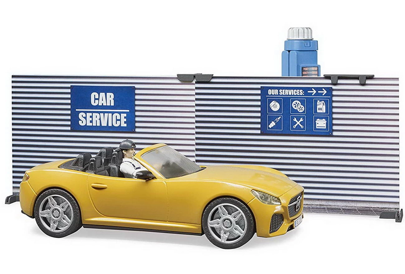 Der BRUDER Roadster ist in diesem tollen Set enthalten. Das Fahrzeug wurde bereits für einen Service gebucht. Ersatzräder sind ebenfalls enthalten und dank des neuen Radwechselsystems des Roadsters ist dies in kürzester Zeit erledigt.