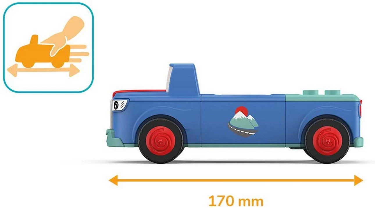 Spannendes, hochwertiges Spielzeug fĂŒr Kinder ab 18 Monaten mit Friktionsmotor (Schwungradmotor) zur Förderung der Feinmotorik, Ausdauer, Geduld und zum SpaĂ haben. Die Spielfigur Mio ist beweglich: Der Kopf lĂ€sst sich drehen, die Arme lassen sich heben und die Beine können angewinkelt werden. Das Fahrzeug Mounty lĂ€sst sich in drei Teile zerlegen und mit weiteren Toddys-Fahrzeugen kombinieren.