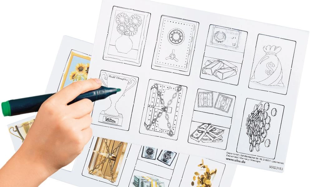 Besonderer Clou: Zwei der Pappbögen sind fertig bedruckt, bei den zwei anderen sind nur die Konturen abgebildet, so dass die einzelnen Elemente selbst ausgemalt und kreativ gestaltet werden können.