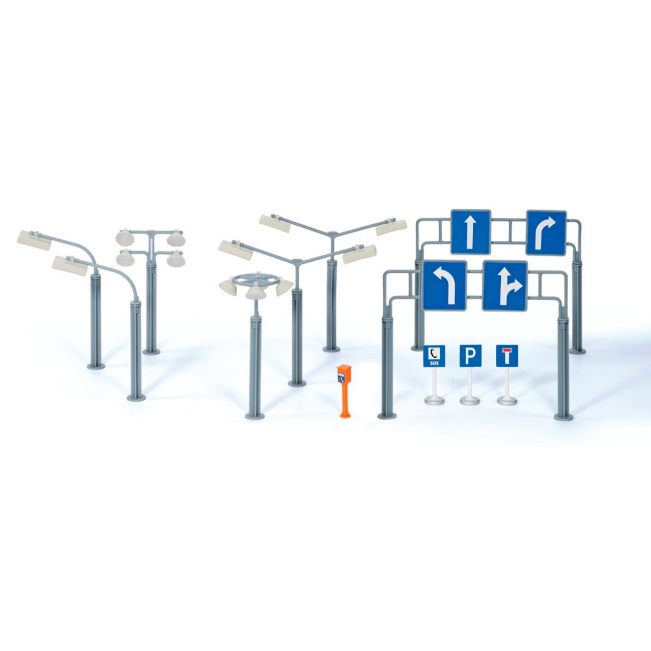 ErgÀnzungsset zur SIKUWORLD mit Strassen-, Parkplatz und Baustellenleuchten sowie diversen Verkehrsschildern.